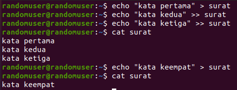 Karakter > akan membelokkan output dari echo menjadi sebuah filebaru bernama surat, Karakter >> akan menyisipkan output dari echo di kelanjutan isi dari file tujuan.