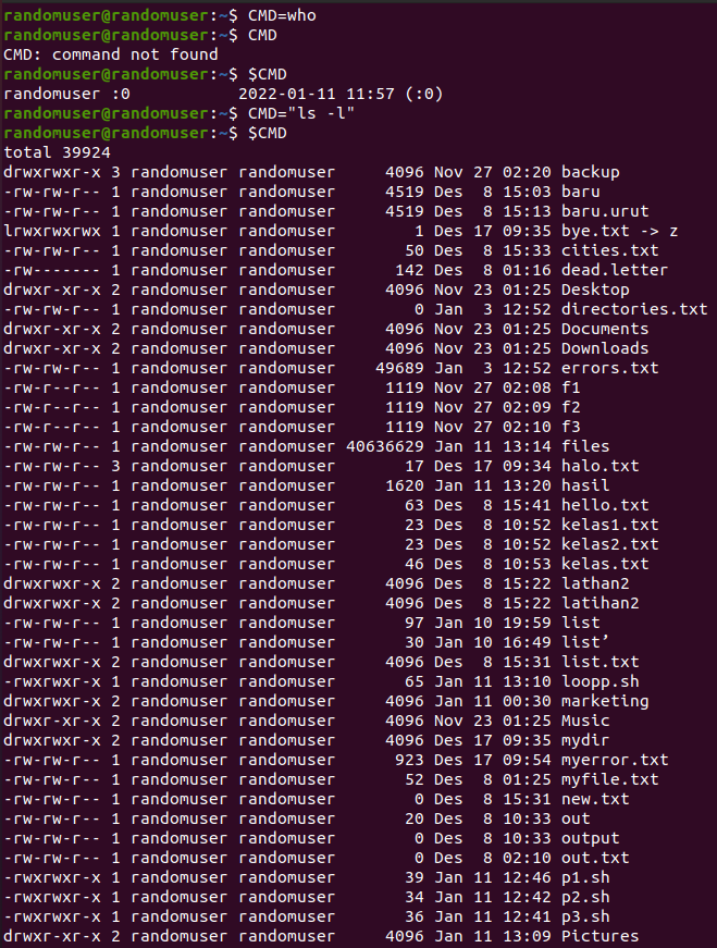 $ CMD digunakan untuk melihat tanggal dan waktu user saat aktif. Variabel dapat dijadikan input shell dan kemudian dapat dieksekusi. Ketika perintah $ $CMD dijalankan, output yang keluar adalah output berupa tanggal dan waktu user aktif. Perintah $ CMD=”ls -l” digunakan untuk melihat file secara lengkap yang dipanggil dengan perintah $ $CMD untuk dieksekusi (sama seperti jika memasukkan perintah ls -l saja). Untuk memasukkan lebih dari satu kata harus diapit dengan tanda petik.
